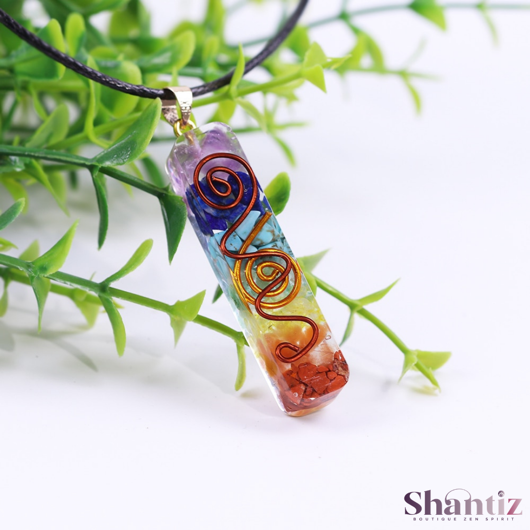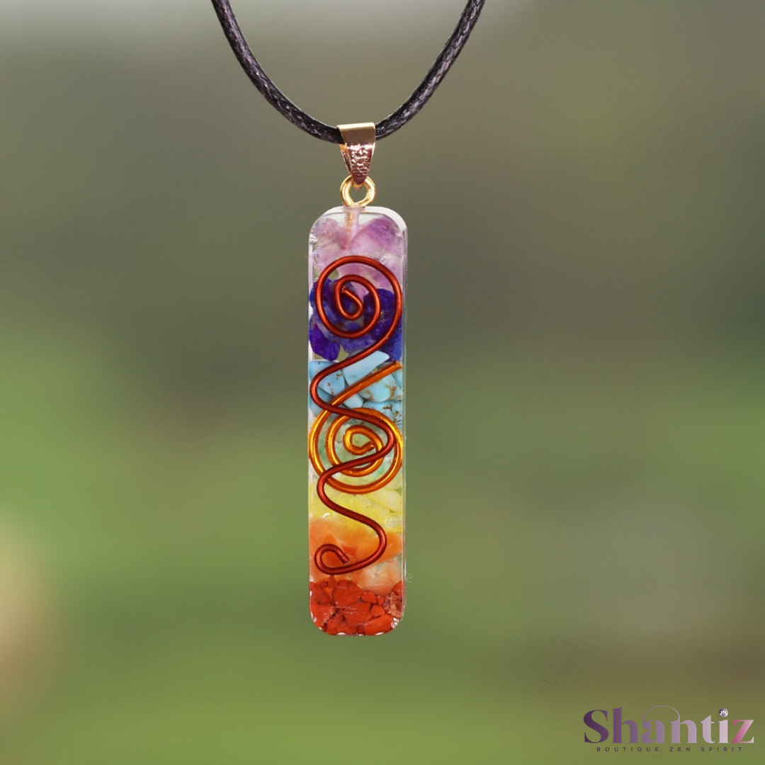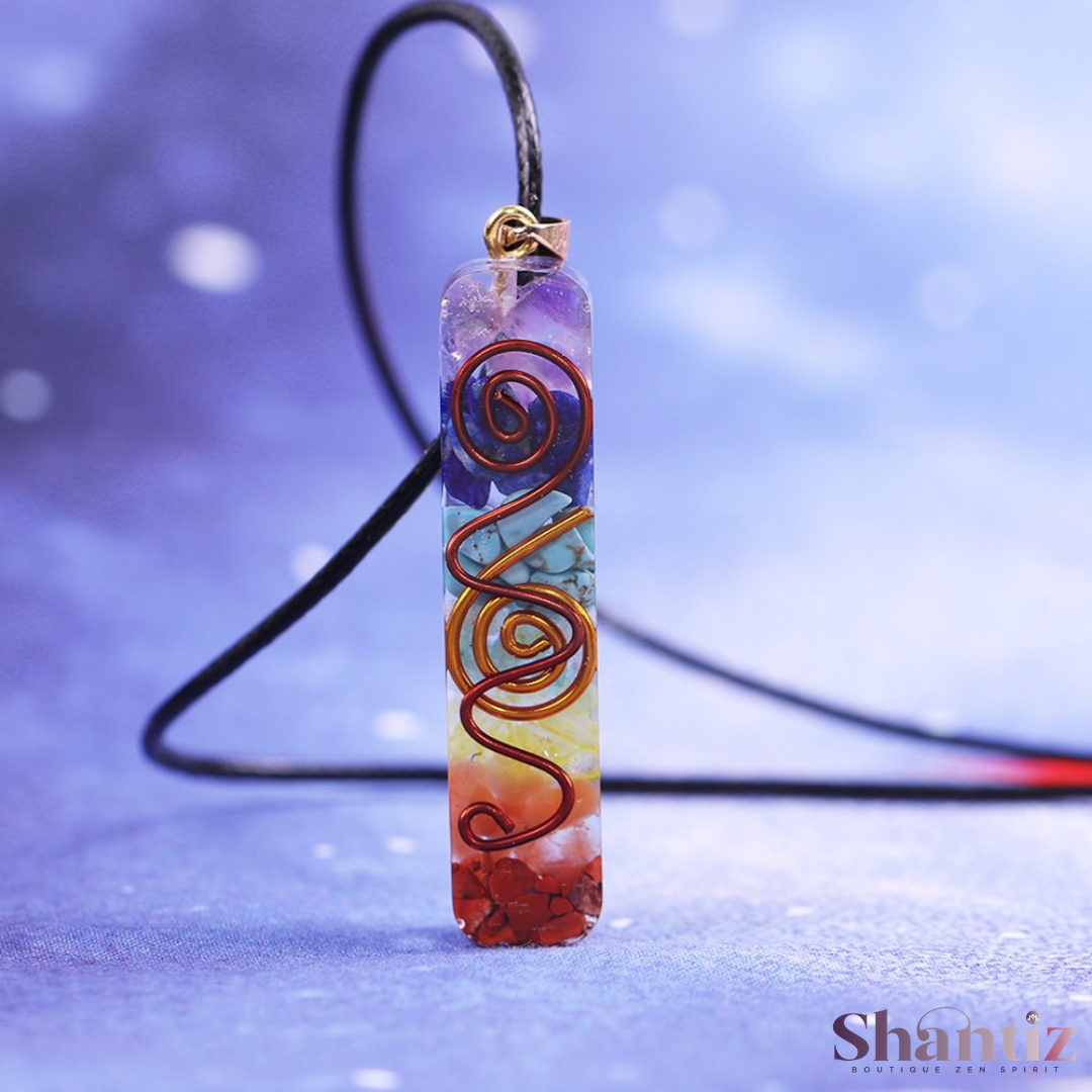 Cette Orgonite Pendentif 7 Chakras vous aidera à dynamiser votre énergie vitale. Ce collier se compose de 7 pierres naturelles connues en lithothérapie pour leurs puissantes vertus :