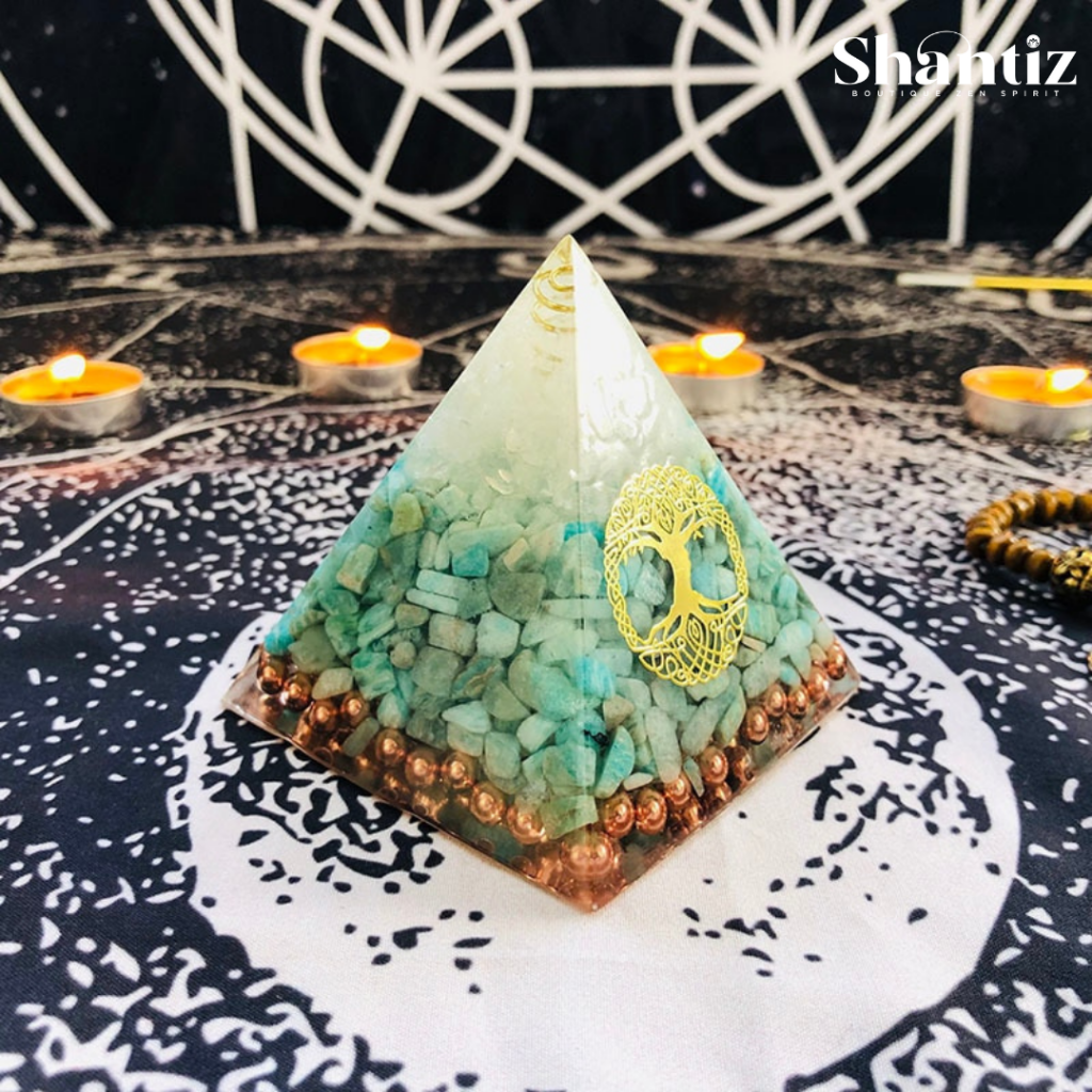 Cette magnifique Pyramide Orgonite Amazonite  Anahata Arbre de Vie favorisera votre optimisme et votre communication.