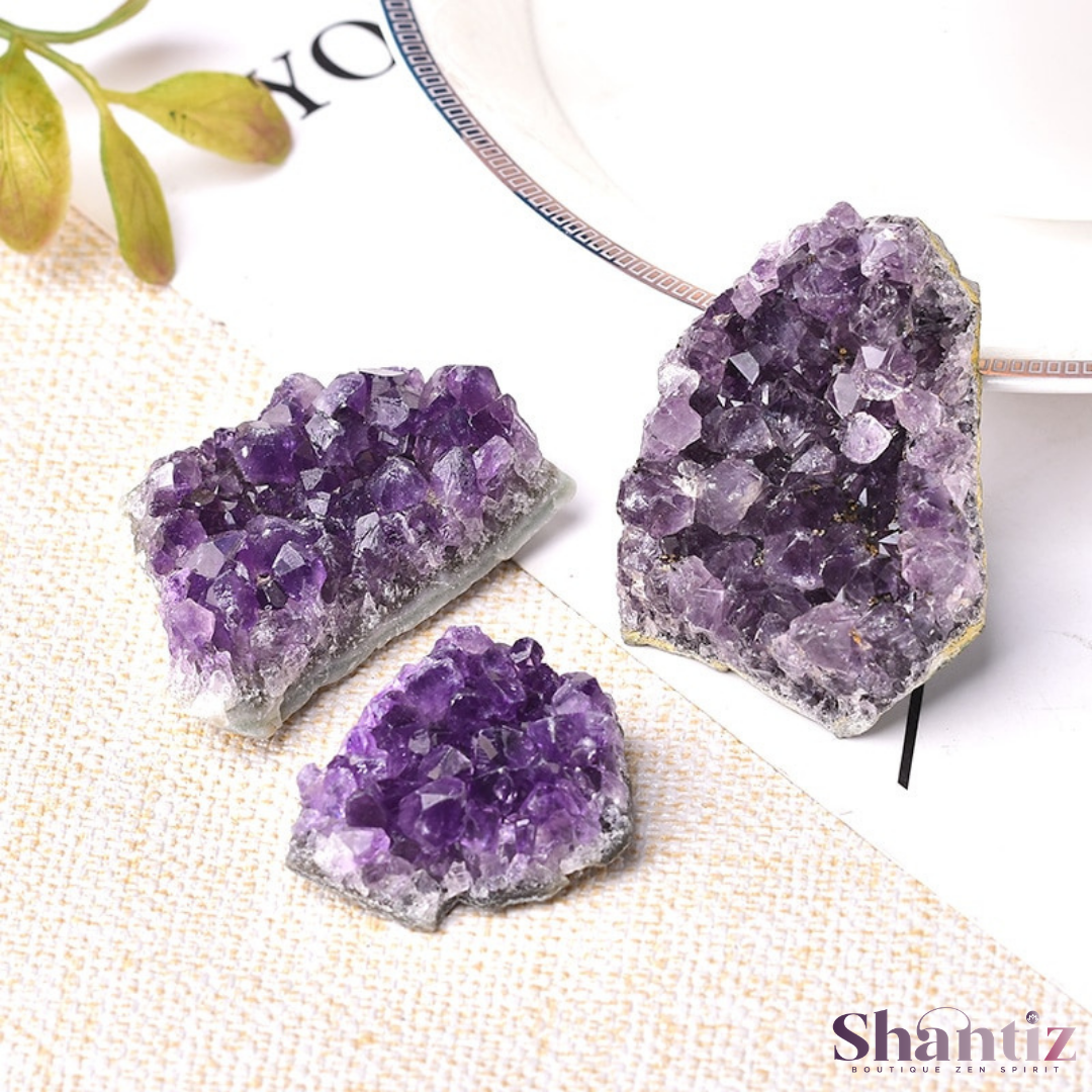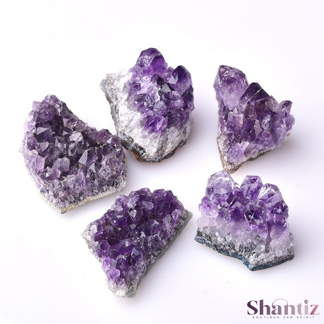 La grappe d'améthyste est une pierre de protection très puissante. Cette pierre naturelle aide à calmer l’esprit et à nous détendre. Elle favorise la connexion avec notre intuition. Dans l’Antiquité cette pierre protégeait de l’ivresse. C’était une pierre ornementale et symbole de richesse et de puissance. L’améthyste est idéale pour pratiquer la méditation.